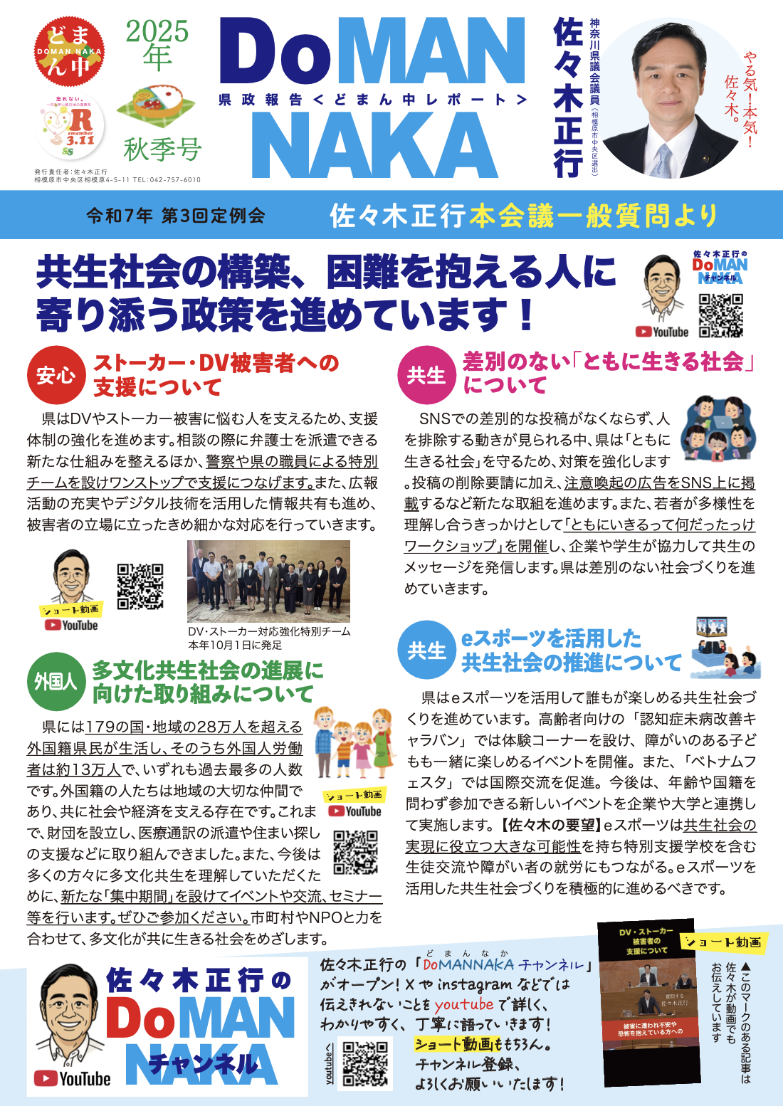 県政報告「DoMAN NAKA」レポート 〜この県政報告をダウンロード〜 2022DoMANNAKA 冬季号表1−4.png 2022DoMANNAKA 冬季号中面.png 〜この県政報告をダウンロード〜 2022DoMANNAKA 秋季号表1-4.png 2022DoMANNAKA 秋季号中面.png 県政報告 DoMANNAKA バックナンバーサイトへ